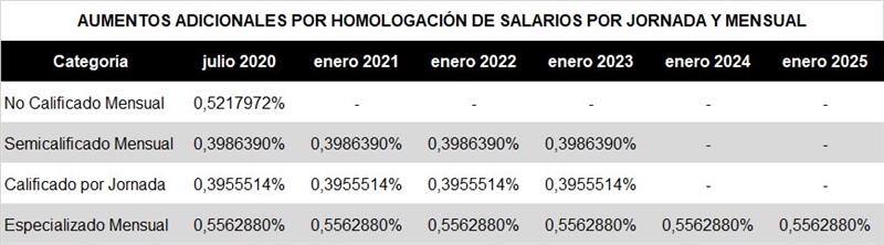 Para homologar dichos salarios (independientemente si el trabajador es contratado por jornada o de forma mensual), a partir del mes de julio de 2020 y según lo que se explica en la tabla adjunta, se aprobarán los siguientes aumentos: