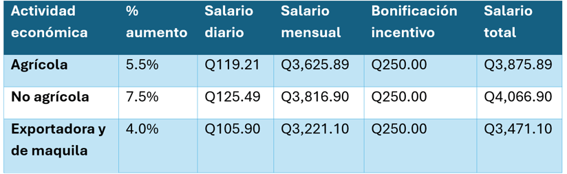 El salario mínimo continúa estructurándose sobre cuatro componentes: salario diario, salario mensual, bonificación incentivo de Q250 y salario total, lo que permite una visualización integral del costo laboral mínimo por trabajador.