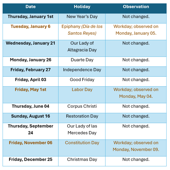 On Wednesday, November 5, an official statement was issued by Mr. Andrés V. Herrera, Director General of Labor, reminding that Law No. 139-97, dated June 19, 1997, and published in Official Gazette No. 9957 on June 25 of the same year, provides for the transfer to Mondays of national holidays that fall on a Tuesday, Wednesday, Thursday, or Friday.
